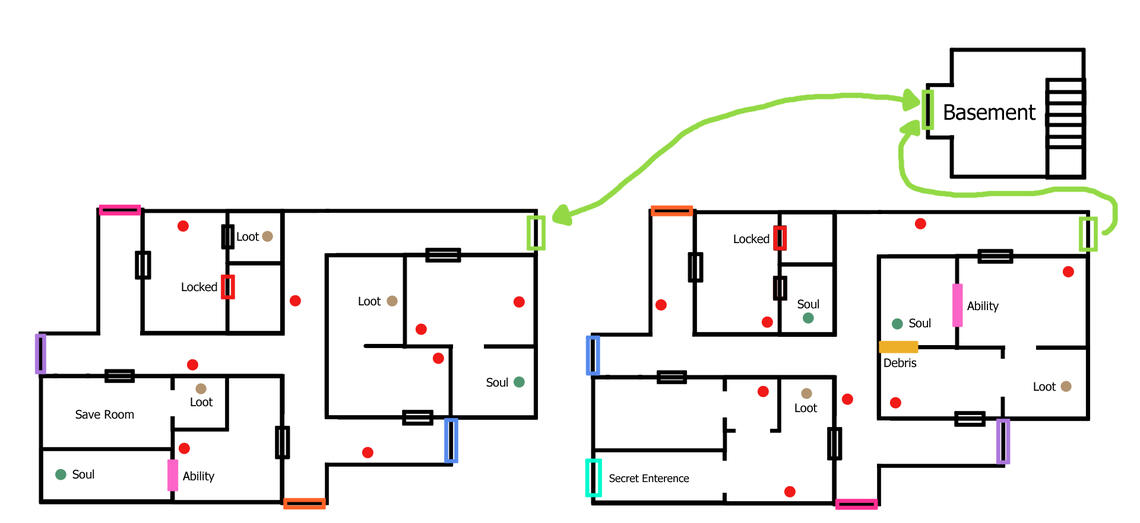 After committing to the large multi-floored metroidvania design process for 6 months I realized it was way too out of scope for a small project.I went back to the drawing board and took key mechanics and puzzles that I enjoyed from the previous iterations and refined the layout into a more compact linear focused 2 floors.I decided to keep the escence of a metroidvania's backtracking but to limit it by having an expanding Hub & Spoke level. The player would still return to older areas with new equipment but this time it would be to traverse to newer unlocked rooms.