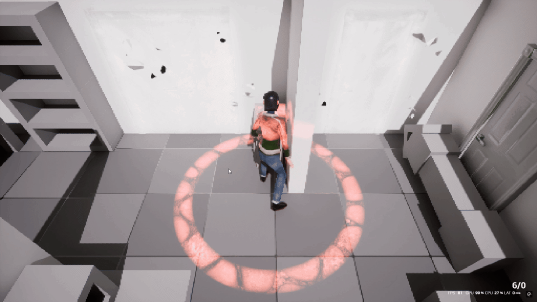 Due to the isometric camera perspective, walls became obstructing to the camera and provided plenty of hiding spots for survivor players.To balance this I created a wall transparency shader to compare when a player is behind a wall and to cut out a small circle to allow them to become visible.This however is only calculated locally for each player so that they can still hide without becoming visible to all players. This in turn added to a very fun interaction where players who walk by a wall can suddenly see a hiding player and choose to hide with them or chase them