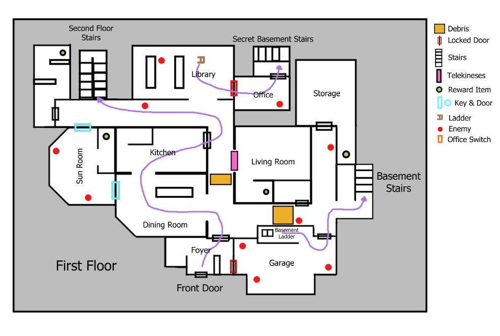 - Obtain a character ability "Telekinesis" from the Parents Bedroom.Once in the final stage the map is completely opened up and progression is controlled through the use of the players final unlocked ability "True Sight".
