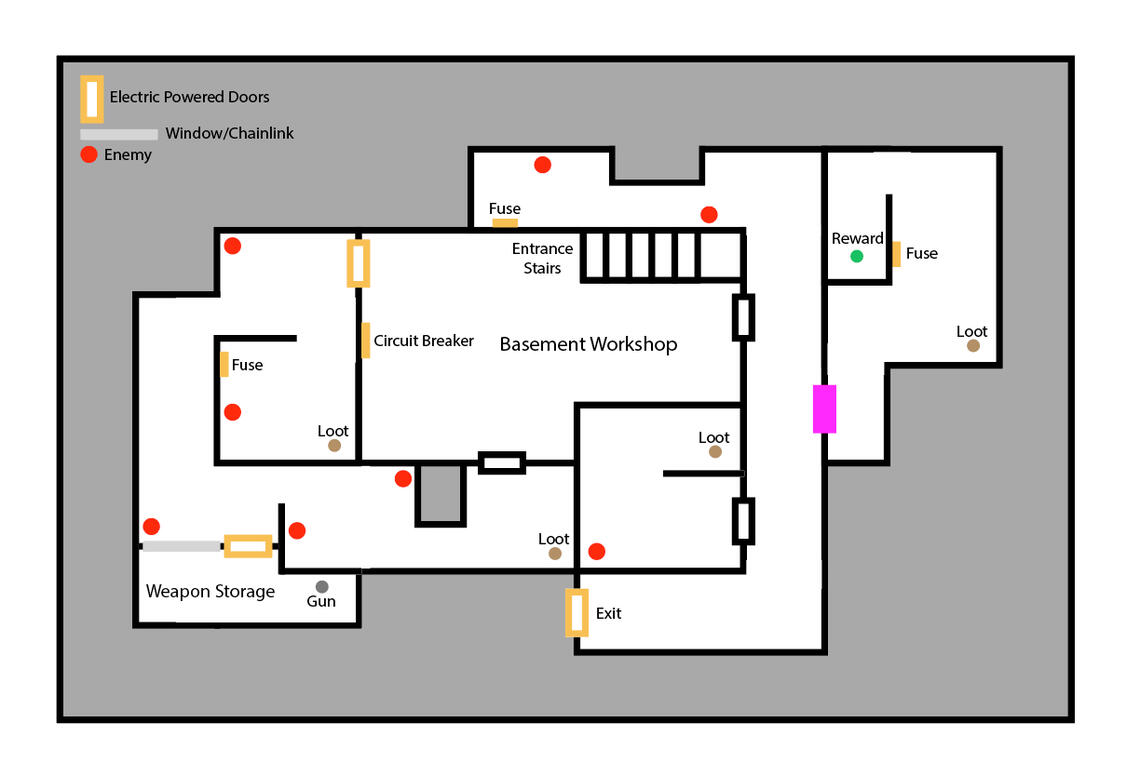 The goal of this puzzle was to create an enclosed area that would provide the player with a powerful weapon once they found 3 Key Items (Fuses). As the reward would be very valuable I scaled the difficulty of the puzzle and increased the cost of resources spent acquiring it.To increase the difficulty I created narrow hallways and obscuring corners filled with multiple enemies where evasion is difficult to force the player into combat.